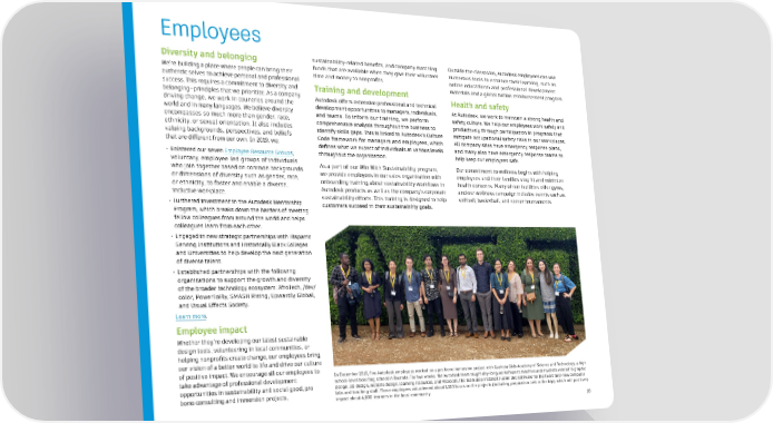10 Diversity and belonging We’re building a place where people can bring their authentic selves to achieve personal and professional success. This requires a commitment to diversity and belonging—principles that we prioritize. As a company driving change, we work in countries around the world and in many languages. We believe diversity encompasses so much more than gender, race, ethnicity, or sexual orientation. It also includes valuing backgrounds, perspectives, and beliefs that are different from our own. In 2019, we: • Bolstered our seven Employee Resource Groups , voluntary, employee-led groups of individuals who join together based on common backgrounds or dimensions of diversity such as gender, race, or ethnicity, to foster and enable a diverse, inclusive workplace. • Furthered investment in the Autodesk Mentorship Program, which breaks down the barriers of meeting fellow colleagues from around the world and helps colleagues learn from each other. • Engaged in new strategic partnerships with Hispanic Serving Institutions and Historically Black Colleges and Universities to help develop the next generation of diverse talent. • Established partnerships with the following organizations to support the growth and diversity of the broader technology ecosystem: AfroTech, /dev/ color, PowerToFly, SMASH Rising, Upwardly Global, and Visual Effects Society. Learn more . Employee impact Whether they’re developing our latest sustainable design tools, volunteering in local communities, or helping nonprofits create change, our employees bring our vision of a better world to life and drive our culture of positive impact. We encourage all our employees to take advantage of professional development opportunities in sustainability and social good, pro bono consulting and immersion projects, sustainability-related benefits, and company matching funds that are available when they give their volunteer time and money to nonprofits. Training and development Autodesk offers extensive professional and technical development opportunities to managers, individuals, and teams. To inform our training, we perform comprehensive analysis throughout the business to identify skills gaps. This is linked to Autodesk’s Culture Code framework for managers and employees, which defines what we expect of individuals at various levels throughout the organization. As a part of our Win With Sustainability program, we provide employees in our sales organization with onboarding training about sustainability workflows in Autodesk products as well as the company’s corporate sustainability efforts. This training is designed to help customers succeed in their sustainability goals. Outside the classroom, Autodesk employees can use numerous tools to enhance their learning, such as online educational and professional development materials and a global tuition reimbursement program. Health and safety At Autodesk, we work to maintain a strong health and safety culture. We help our employees work safely and productively through participation in programs that mitigate occupational safety risks in our workplaces. All company sites have emergency response plans, and many also have emergency response teams to help keep our employees safe. Our commitment to wellness begins with helping employees and their families stay fit and minimize health concerns. Many of our facilities offer gyms, and our wellness campaign includes events such as softball, basketball, and soccer tournaments. Employees In December 2019, five Autodesk employees worked on a pro bono immersion project with Gashora Girls Academy of Science and Technology, a high school-level boarding school in Rwanda. For two weeks, the Autodesk team taught day-long workshops to teachers and students related to graphic design, 3D design, website design, learning resources, and Micro:bit. The team also installed Fusion 360 software for the two brand-new computer labs and teaching staff. These employees volunteered about 1,100 hours on the projects (including preparation before the trip), which will positively impact about 4,000 learners in the local community.