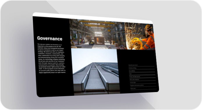Governance The way we conduct our business is as important as the products we sell. We maintain robust and transparent processes to govern Autodesk as well as our impact strategy. We build trust with our employees, customers, investors, communities, and other stakeholders by acting with integrity and demonstrating strong and consistent values. As a technology company, protecting the privacy and security of our customers’ data through rigorous policies, systems, and practices is essential. More broadly, Corporate governance we promote human rights across our value chain. To drive progress across industries, Company strategy we promote public policies that align withour Accountability impact opportunity areas in an open manner. Trust Privacy and data security Ethics and compliance Human rights Suppliers and business partners Public policy