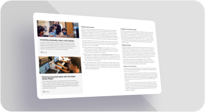 Employee resource groups Transgender and nonbinary inclusion We have a vibrant and growing network of global Employee Resource Groups (ERGs), In addition to Autodesk earning a 100% rating and designation as a Best Place to Work employee-led groups composed of individuals who join together based on common for LGBTQ Equality on the Human Rights Campaign Foundation’s Corporate Equality Index, backgrounds or dimensions of diversity such as gender, race, or ethnicity. Each ERG the Pride ERG formed an initiative to provide peer mentorship and advance inclusion is sponsored by a member of our Executive Leadership Team, and our ERG leaders are for transgender and nonbinary employees. In partnership with the Culture, Diversity supported as a critical extension of our Culture, Diversity & Belonging team. ERGs play key & Belonging team, during 2021 the group helped expand options for pronoun visibility roles in driving professional development, building partnerships with local communities, across Autodesk employee directories, worked to evaluate access to all-gender restrooms advancing recruitment efforts, and supporting a culture of mentorship and coaching. in of昀椀ces globally, and collaborated with the company’s bene昀椀ts team to remove any Currently, Autodesk has seven ERGs: Asian Network, Black Network, Latinx Network, remaining restrictions on gender-af昀椀rming health bene昀椀ts under our primary US Connecting community, culture, and creativity Pride Network, Veterans Network, Women’s Network, and Young Professionals Network. insurance vendors. In response to the challenge of physical distancing during the COVID-19 Autodesk’s ERGs are evolving to make an even greater impact on our employee Programs worldwide pandemic, Gail Tanaka, Global Lead of the Autodesk Asian Network, initiated experience and our business globally. During 2021, employees in Autodesk locations around the world advanced diversity and a program with a nonpro昀椀t organization, Kimochi, to teach seniors and youth ● In 2021, Autodesk’s held its 昀椀rst ERG Week, a series of global events focused on belonging through a broad range of initiatives. For example, in our Europe, Middle East, how to use Autodesk Tinkercad as a way to continue creating Japanese celebrating and elevating ERGs. To bring the programming to life in a virtual world, and Africa region, the Autodesk France Country Council, composed of senior leaders, American cultural items such as cherry blossoms together. each group brought in dynamic voices from both inside and outside the company people managers, and individual contributors across business organizations, adopted 10 Learn more for inspirational talks, networking events, and more. initiatives during the year to advance equity and access. For example, the council engaged ● Beginning in 2022, Autodesk will grant a $10,000 appreciation bonus each April to our with local stakeholders Capital Filles and 10000 Codeurs to mentor and coach diverse global ERG leads, on completion of every year of service, for the many ways they help young talent and led discussions associated with the International Day of People with our employees feel supported and included, both in times of celebration and in the Disabilities to change the way disability is perceived within the company. face of social injustice. Autodesk is proud to make this investment in the future leaders The Autodesk Italy Leadership team joined Valore D, a corporate association that of our work culture—and our company. promotes gender balance and an inclusive approach to company- and country-level ● To scale and operationalize impact, we've formed expert “MERG” groups to align growth. This organization helps people learn, adapt, and prosper through change via program strategy and intersectional development across all ERGs. We work together courses, best practice sharing, mentoring, and other activities. to build a strong team of cross-ERG support, and we utilize resources, passion, and Programs across the business energy to impact lasting change for all employees at Autodesk, especially those in historically marginalized groups. Across business units within Autodesk, grassroots groups of employee volunteers help foster a culture of belonging within their teams. Each group has senior leadership support Image courtesy of The Hidden Genius Project and an executive sponsor at the VP level. In Finance, the Diversity & Belonging Committee hosted Power of Inclusion trainings and Nurturing young tech talent with The Hidden quarterly guest speakers, and in 2021 it sponsored 13 employees for the annual WILpower Genius Project program, a professional development and networking program for women offered by LWT (Leading Woman in Technology). The group also partnered with DreamWakers 昀氀ashchats The Autodesk Black Network leads workshops through The Hidden Genius to connect 458 students from 11 underresourced K–12 schools with Autodesk career Project, a national nonpro昀椀t organization that trains and mentors young Black role models. men in technology creation, entrepreneurship, and leadership skills. Starting The Legal Diversity Inclusion & Belonging (LDIB) group is composed of volunteers in 2022, Autodesk has committed to donating $150,000 to the organization for dedicated to promoting Autodesk’s values within the department and wider legal each of the next three years. community. In 2021, the team focused its efforts on lifting up underrepresented groups in the legal 昀椀eld and also sponsored career development training through the Leading Learn more Women in Technology program, which was offered for the 昀椀rst time to all employees regardless of geography.