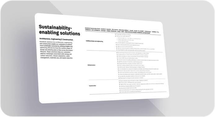 77 ® ® ® ® ® ® ® Autodesk Construction Cloud , Autodesk AutoCAD , CFD, Civil 3D , Fabrication CAMduct™, FormIt , FormIt Pro, Info360™, InfoDrainage™, InfoWater Pro, ® ® ® ® ® ® ® Sustainability- InfoWorks ICM, InfraWorks , Innovyze , Insight, Navisworks , ReCap , Revit , Robot Structural Analysis Professional, and Spacemaker ● Design high-performance buildings enabling solutions ● Optimize total carbon ef昀椀ciencies • Reduce embodied carbon through design and material speci昀椀cation • Conduct energy analysis at key project stages Architecture, Engineering & Construction Building design and engineering • Optimize HVAC system design ● Use clash detection during design to reduce waste in construction Autodesk solutions for architecture, engineering, ● Plan for smart decommissioning and materials recovery and construction enable our customers to achieve ● Improve structural material ef昀椀ciency more sustainable outcomes by utilizing insights and ● Optimize site planning with AI to make informed choices around daylight, noise, sun, and wind optimizing ef昀椀ciencies from the earliest stages of ● Help mitigate the urban heat island effect with microclimate analysis design and allowing data to 昀氀ow across the project ● Plan and design infrastructure for resilience and adaptation to climate change lifecycle. These solutions help our customers ● Visualize projects in context of the surrounding built and natural conditions address challenges associated with energy and ● Perform simulations to assess environmental and social impacts of designs carbon reduction, climate adaptation, water ● Conduct traf昀椀c 昀氀ow and mobility impact studies management, materials use, and waste reduction. ● Evaluate scenarios for grading optimization to minimize material waste and optimize movement of dirt ● Optimize outcomes for inland and coastal 昀氀ooding projects ● Manage bioretention and green stormwater infrastructure Infrastructure ● Reduce roadway embodied carbon and natural resource inputs ● Optimize water drainage network and pipes to mitigate 昀氀ooding ● Turn stormwater into a resource by designing sustainable urban drainage reservoirs for water reuse ● Forecast storm and sewer surge events to ensure safety during construction ● Model water distribution systems to enable clean drinking water reaches homes ● Model and simulate sewer collection, wastewater treatment plants, and other water quality–related systems ● Use real-time, actionable insights to enhance service reliability ● Help prepare for emergencies and maintenance schedules ● Reduce embodied carbon through low-carbon material procurement ● Minimize waste in MEP fabrication and installation Construction ● Improve 昀氀ow, reduce waste, and drive continuous improvement with end-to-end lean construction technology ● Seamlessly integrate prefabrication into projects ● Help improve worker health and safety ● Avoid rework and prevent waste by always working from the right plans and docs ● Increase precision to maximize built performance