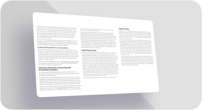 Supplier diversity In the Platform Services & Emerging Technologies (PSET) organization, the PSET-DIB resources and learn from participating organizations to advance a more inclusive At Autodesk, we use our purchasing power to increase diversity and inclusion in our initiative works to ensure broader participation in envisioning the innovations of the innovation ecosystem and funding landscape. supplier base, helping to create jobs and wealth in historically marginalized communities. future by fostering a culture of equity and belonging within the department. The goals The Foundation’s response and rebuilding grants and support have bene昀椀ted from We value our impactful relationships with small and person of color-, women-, disability-, of the core team are to build and maintain avenues of communication to increase the collaboration with the company’s Culture, Diversity & Belonging team and ERGs veteran-, service-disabled veteran-, and LGBTQ+-owned businesses. Creating a supplier impact of diversity and belonging programs within PSET, normalize conversations representing the people and communities impacted. Beyond this funding, the Foundation base that re昀氀ects the demographics of Autodesk’s marketplace provides us with access to and critical thinking on topics of equity to further Autodesk’s culture goal around has committed to integrating diversity, equity, and inclusion goals throughout its work, better ideas and ways to innovate. psychological safety, and develop leadership and power skills together through from how it sources new organizations for its portfolio to the impact it seeks to realize In 2021, we engaged with certifying agencies to help diverse business owners expand peer mentorship and learning. through its grantmaking and impact investing. For example, in 昀椀scal year 2022 the their capabilities by connecting them with mentoring, training, and business development In the Product Development and Manufacturing Solutions (PDMS) organization, the Culture, Foundation provided a $250,000 grant to Revolution Workshop, a nonpro昀椀t providing opportunities. During the year, we mentored two Black female entrepreneurs as a part D&B advisory team works to prioritize timely ampli昀椀cation of Autodesk diversity and construction job training on the West and South Sides of Chicago, predominantly Black of the National Black Business Pitch, a competition designed to connect Black women– belonging messaging, programs, and resources; identify unique opportunities for in昀氀uence and LatinX neighborhoods. In February 2022, Autodesk was a launch supporter of the owned businesses to prospective customers. We also sponsored a cohort of eight women- within the organization; and communicate learnings and feedback. Black Equity Index (BEI), a new initiative for organizations to advance and measure owned businesses for the WBEC-West Platinum Supplier Program, for women-owned Providing a positive experience on our internal platforms progress toward racial equity in the workplace. businesses certi昀椀ed by WBENC (Women’s Business Enterprise National Council) that Supporting pay equity are working to begin or expand corporate and government contracting. To increase our With our remote and hybrid work environment, reliance on Slack and other social awareness and engagement with diverse businesses, Autodesk belongs to the National platforms is essential. As with any social platform, some messages may not align with Autodesk is committed to pay equity for our employees. We conduct an annual global LGBT Chamber of Commerce, the Western Regional Minority Supplier Development our policies or guidelines. To create a safe and positive experience on our internal pay analysis to compare pay levels of different demographic groups, and make Council, and tech:SCALE. community platforms, we created guidelines for our employees and contingent workers appropriate adjustments if needed. We’ve continued Fair Pay at Hire, which means that To further drive results, in 2021 we launched the internal Autodesk Supplier Diversity to follow when communicating with peers. We also added a new “昀氀ag” feature in Slack we do not ask candidates about their prior company compensation in the United States. Executive Stakeholders group, which works to develop goals for each of the company’s to enable employees to report messages that they feel violate Autodesk’s policies, Autodesk was also a proud early signer of the California Equal Pay Pledge, which af昀椀rms principal organizations. We spent $35 million, equivalent to 4.4% of addressable spend, guidelines, or culture of respect. the commitment to conducting annual pay analysis, reviewing hiring and promotion with approximately 210 US-based diverse businesses in 昀椀scal year 2022, meeting our goal Additionally, in February 2022 Autodesk added a statement about our stance on racism processes and procedures to reduce unconscious bias and structural barriers, and 2 of 4% for the year. During 昀椀scal year 2023, we aim to increase this to 8% of addressable to the company’s Code of Business Conduct, as well as within our internal Global promoting best practices that will close the pay gap. We are transparent about our spend in the United States, and 25% by 昀椀scal year 2026. We are exploring expanding our Discrimination, Harassment, and Bullying Policy. salary structures, bonus targets, and equity guidelines to let employees know how they program to additional countries and regions. Advancing racial justice in partnership with compare to our de昀椀nition of market. To attract, retain, and support our highly quali昀椀ed employees, we offer competitive compensation and bene昀椀ts, which include an element the Autodesk Foundation of choice to meet the needs of our diverse population globally. As of 昀椀scal year 2021, As violence against historically marginalized communities continued in 2021, we all employees participate in 