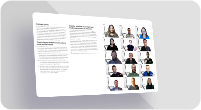 Employee giving Enabling Autodesk sales employees In a year when many organizations and individuals needed extra to advance sustainable outcomes support, Autodesk employees responded by donating record The Autodesk Making the Future sales incentive program amounts to nonpro昀椀ts around the world. Employees receive 1:1 rewards Autodesk sales teams for partnering with customers to matching funds from the Autodesk Foundation, doubling the achieve outcomes aligned with the United Nations Sustainable impact of their charitable giving to communities and causes they Development Goals. Winners in 昀椀scal year 2022 spanned account care about most. During 2021, the yearly matching cap was sizes and industries, and included Cemex, Compesa, Iberdrola, increased from $3,000 to $5,000, and speci昀椀c crisis response and Setty & Associates. causes received a 2:1 match, such as assistance after Tropical Our Sustainability G.O.A.L. Program equips our customer-facing Storm Grace in Haiti and COVID-19 relief in India. employees with information, resources, and skills to support Supporting our technical community to customers on their sustainability journeys and create positive drive positive impact impact with the Autodesk technology platform. During 2021, the program grew to more than 300 employees and executives As a technology company, our technical employees play a pivotal from across the company, representing sales and customer role in driving impact. We offer incentives to engage their critical success as well as marketing, brand, business development, and and emerging skills, and we encourage innovative thinking that other groups from all regions globally. motivates and effects positive change in the world: ● As part of our annual technical summit, we give a Better World Learn more about our employees’ connection to giving and community. Builder Award—selected from nominees across the company— for outsized contribution toward helping our customers design and make a better world using Autodesk technology. ● The Employee patent program incentivizes creative thinking and sustainable innovation; employees who have new patents granted are given bonuses of up to $2,000. ● Autodesk's Impact Team rewards employees across the company who make exceptional contributions related to climate change. These individuals are awarded “Autobucks” and “Applause Points,” spot cash, or other non-monetary awards and recognition on the company intranet.
