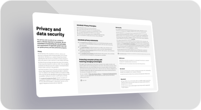 Autodesk Privacy Principles Data security ● Be transparent about our actions and intent. The Autodesk security framework was designed around industry standards to ensure ● Present individuals with clear and actionable choices. consistent security practices, enabling us to build secure, run secure, and stay secure. Privacy and ● Practice purposeful collection, use, and retention of data. Autodesk implements security policies based on industry best practices. We regularly ● Use data for the purposes for which it was collected. conduct internal and external audits, attestations, and third-party security assessments to ● Share data with third parties only in limited and approved ways. monitor changes in the environment, test our policies and procedures, and identify new data security ● Be accountable for enforcement of these Privacy Principles. and emerging risks. We meet our obligations under the General Data Protection Regulation and the California Consumer Privacy Act. Read FAQs. Autodesk privacy statements We continuously monitor the environment for threats and take detective, corrective, and The privacy and security of our customers’ protective measures to ensure a swift response when incidents do occur. Autodesk Security data is critically important to Autodesk. We are ● The Autodesk Privacy Statement explains how we handle personal data, how such responds to any security incidents or vulnerabilities detected internally or reported through committed to incorporating the core principles data can be accessed and updated, and how we protect this data when interacting external parties, and we publish security bulletins and advisories regarding vulnerabilities with third parties. that could adversely affect Autodesk products or services. Our systems are designed to be and requirements of applicable global laws into ● The Cookie Statement describes the way we use cookies, tags, and pixels in our scalable and resilient, to ensure availability to customers. our global privacy and data protection program. applications. It contains a link to a tool for users to set their cookie preferences. We have selected industry standard attestations and certi昀椀cations for our products— ● The Children’s Privacy Statement addresses how we collect, process, store, and delete SSAE-16 AT 101 SOC 2 attestation, ISO 27001, ISO 27017, and ISO 27018 certi昀椀cations. Privacy children’s personal data. ● The Candidate Privacy Statement describes how we collect, process, store, and delete See a detailed summary of attestations and certi昀椀cations associated with Autodesk products and services. We build privacy into our products, services, culture, and personal data about job applicants and prospective candidates. processes to keep pace with evolving regulations and customer expectations. We believe our customers should have choices Build secure regarding their data and we are committed to being transparent Protecting consumer privacy and about what data we collect, and how it’s used, shared, and stored. Embedding security into our products is a critical part of securing our customers’ investment in Autodesk products and services. We follow Privacy by Design principles that govern the treatment fostering emerging technologies of data owned by Autodesk or under our control. These are applied We support technology policies that enhance consumer trust, enable innovation, and We build security into our products and services from the ground up. worldwide and re昀氀ected across the company in development plans, promote global trade in technology products and services. This includes enacting a strong business plans, and day-to-day operations. federal privacy law in the United States that gives consumers better information about, We follow Autodesk’s Privacy Principles (see box) and perform and control over, how their personal data is collected and used, enhances obligations on Run secure privacy impact assessments where personal data is collected or companies handling this data, and raises standards and provides consistent protections Securing our infrastructure is another critical way that we protect the con昀椀dentiality, used. Our employees and contingent workers are required to comply for consumers throughout the country. integrity, and availability of our customers’ information. with our privacy policies, standards and guidelines. We alsoprovide We are a member of BSA | The Software Alliance and Information Technology Industry We also build security directly into our products and deployment infrastructure. our workforce with general and role-speci昀椀c privacy training. Council (ITIC) and support their work advocating for public policies that improve The Autodesk Transparency Report explains our policy on privacy protections. responding to requests for customer data by government agencies Stay secure for law enforcement purposes, and provides statistics on the Learn more types of requests we receive and our responses. Gaining visibility into our environment offers us valuable insight into persistent suspicious activity, active security incidents, and ongoing exploits impacting Autodesk and our customers. We take proactive steps to defend against these threats with the appropriate incident response.