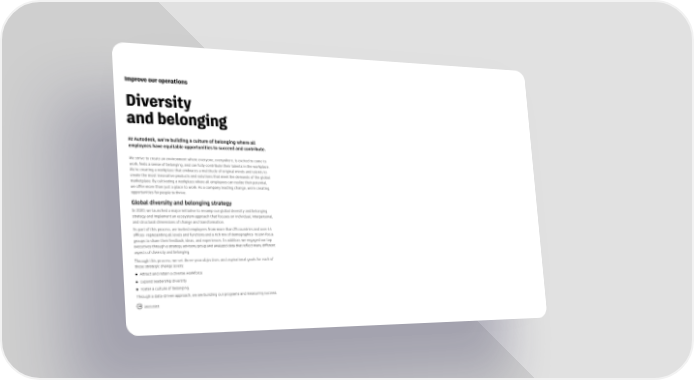Improve our operations Diversity and belonging At Autodesk, we’re building a culture of belonging where all employees have equitable opportunities to succeed and contribute. We strive to create an environment where everyone, everywhere, is excited to come to work, feels a sense of belonging, and can fully contribute their talents in the workplace. We’re creating a workplace that embraces a multitude of original minds and talents to create the most innovative products and solutions that meet the demands of the global marketplace. By cultivating a workplace where all employees can realize their potential, we offer more than just a place to work. As a company leading change, we’re creating opportunities for people to thrive. Global diversity and belonging strategy In 2020, we launched a major initiative to revamp our global diversity and belonging strategy and implement an ecosystem approach that focuses on individual, interpersonal, and structural dimensions of change and transformation. As part of this process, we invited employees from more than 25 countries and over 44 of昀椀ces—representing all levels and functions and a rich mix of demographics—to join focus groups to share their feedback, ideas, and experiences. In addition, we engaged our top executives through a strategy advisory group and analyzed data that re昀氀ect many different aspects of diversity and belonging. Through this process, we set three-year objectives and aspirational goals for each of these strategic change levers: ● Attract and retain a diverse workforce ● Expand leadership diversity ● Foster a culture of belonging Through a data-driven approach, we are building our programs and measuring success. Learn more