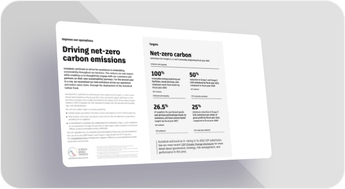 Improve our operations Targets * Driving net-zero Net-zero carbon carbon emissions emissions for Scopes 1, 2, and 3 annually, beginning 昀椀scal year 2021 Achieved and ongoing Autodesk continues to strive for excellence in embedding % % sustainability throughout our business. This reduces our own impact 100 50 while enabling us to thoughtfully engage with our customers and renewable energy powering our reduction in Scope 1 and Scope 2 partners on their own sustainability journeys. For the second year facilities, cloud services, and GHG emissions by 昀椀scal year 2031, in a row, we neutralized our GHG emissions across our operations employee work from home by compared to 昀椀scal year 2020 and entire value chain, through the deployment of the Autodesk † Carbon Fund. 昀椀scal year 2021 SBTi validated SBTi validated Autodesk 昀椀rst committed to achieving net-zero carbon across Scopes 1, 2, and 3 on an Achieved and ongoing 37% reduction achieved annual basis beginning in 昀椀scal year 2021. Since setting this target, de昀椀nitions of net- zero have converged; most notably illustrated by the release of the Science Based Targets initiative’s (SBTi) Corporate Net-Zero Standard in October 2021. We welcome this increased rigor and standardization. % % Our net-zero carbon target is a journey guided by: 26.5 25 ● Climate targets grounded in the latest science and aligned to a 1.5˚C climate trajectory of suppliers for purchased goods minimum reduction in Scope 3 ● Prioritization of internal investments and activities that decarbonize our operations and services and business travel, by GHG emissions per dollar of and those of our suppliers emissions, will have science-based gross pro昀椀t by 昀椀scal year 2031, ‡ ● A commitment to neutralize and compensate for all remaining Scope 1, 2, and 3 emissions targets by 昀椀scal year 2027 compared to 昀椀scal year 2020 on an annual basis through the purchase of high-impact carbon avoidance and removal SBTi validated offsets, as well as renewable energy certi昀椀cates. The SBTi validated our GHG emissions reduction targets in 昀椀scal year 2022 and determined 15% achieved 67% reduction achieved§ that our 昀椀scal year 2031 Scope 1 and 2 target is aligned with the 1.5˚C trajectory. Our Environmental Policy underpins the company’s efforts in our own operations and with our products and services. Autodesk achieved an A- rating in its 2021 CDP submission. * Since setting this target in 2020, de昀椀nitions of net-zero carbon have increasingly See our most recent CDP Climate Change disclosure for more standardized. We continue to align our activities with best practice. † To estimate home of昀椀ce energy consumption, we follow the Work from Home methodology “No Survey” approach that was developed by Anthesis. detail about governance, strategy, risk management, and ‡ This target covers all of Autodesk’s Scope 3 emissions, expanding on the categories included in our SBTi-validated Scope 3 emissions target. performance in this area. § This reduction was largely due to a 93% decrease in GHG emissions from business travel and employee commuting as a result of COVID-19 travel restrictions. We anticipate an increase in business travel-related and overall Scope 3 GHG emissions in the coming years.