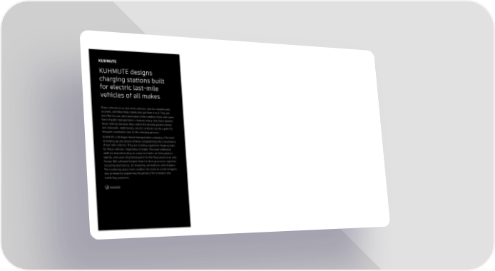 KUHMUTE KUHMUTE designs charging stations built for electric last-mile vehicles of all makes Often referred to as last-mile vehicles, electric skateboards, scooters, and bikes help commuters get from A to B. They are low effort to use, and commuters often combine them with some form of public transportation. However, many cities have banned these vehicles because they clutter the already packed streets and sidewalks. Additionally, electric vehicles can be a pain for frequent commuters due to the charging process. KUHMUTE, a Michigan-based transportation company, is focused on tidying up city streets without compromising the convenience of last-mile vehicles. They are creating organized charging hubs for these vehicles—regardless of make. The team embraced additive manufacturing as a way to iterate on their product rapidly, and used 3D printed parts for the 昀椀nal product as well. Fusion 360 software helped them tie their processes together, including electronics, 3D modeling, animations, and imagery. The rendering space even enables the team to create imagery and animations explaining the product for investors and marketing purposes. Learn more