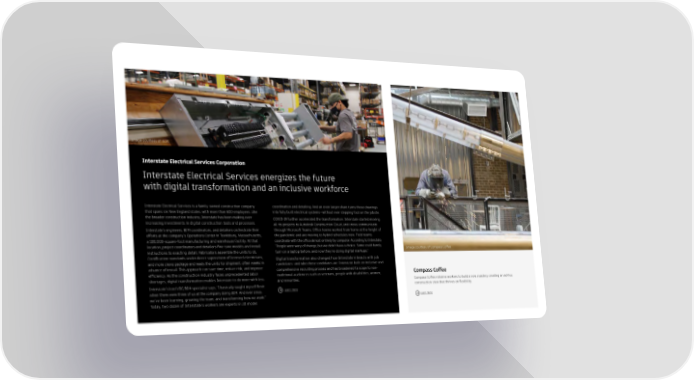 Image courtesy of IESC Interstate Electrical Services Corporation Interstate Electrical Services energizes the future with digital transformation and an inclusive workforce Interstate Electrical Services is a family-owned construction company coordination and detailing. And an even larger share turns those drawings that spans six New England states, with more than 600 employees. Like into fully built electrical systems—without ever stepping foot on the jobsite. the broader construction industry, Interstate has been making ever- COVID-19 further accelerated the transformation. Interstate started moving increasing investments in digital construction tools and processes. all its projects to Autodesk Construction Cloud, and crews communicate Interstate’s engineers, BIM coordinators, and detailers orchestrate their through Microsoft Teams. Of昀椀ce teams worked from home at the height of efforts at the company's Operations Center in Tewksbury, Massachusetts, the pandemic and are moving to hybrid schedules now. Field teams a 100,000-square-foot manufacturing and warehouse facility. At that coordinate with the of昀椀ce almost entirely by computer. According to Interstate, location, project coordinators and detailers 昀椀ne-tune models and install “People were wary of change, but we didn’t have a choice. Some could barely Image courtesy of Compass Coffee instructions to exacting detail. Fabricators assemble the units to UL turn on a laptop before, and now they’re doing digital markups.” Certi昀椀cation standards under direct supervision of licensed electricians, Digital transformation also changed how Interstate interacts with job and more crews package and ready the units for shipment, often weeks in candidates–and who those candidates are. Interstate built an inclusive and advance of install. This approach can save time, reduce risk, and improve comprehensive recruiting process and has broadened its scope to non- ef昀椀ciency. As the construction industry faces unprecedented labor traditional audiences such as veterans, people with disabilities, women, Compass Coffee shortages, digital transformation enables Interstate to do more with less. and minorities. Compass Coffee retrains workers to build a new roastery, creating an ad-hoc Interstate’s lead VDC/BIM specialist says, “I basically taught myself Revit construction crew that thrives on 昀氀exibility. when there were three of us at the company doing BIM. And ever since, Learn more we’ve been learning, growing the team, and transforming how we work.” Learn more Today, two dozen of Interstate’s workers are experts in 3D model