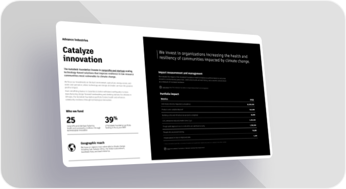 Advance industries Catalyze We invest in organizations increasing the health and innovation resiliency of communities impacted by climate change. The Autodesk Foundation invests in nonpro昀椀ts and startups scaling Impact measurement and management technology-based solutions that improve resilience in low resource We evaluate the impact of the Autodesk Foundation Health & Resilience portfolio based on outcomes communities most vulnerable to climate change. related to environmental protection, community health and well-being, and economic advancement as a measure of increased resilience. We focus our investments on the built environment, agriculture, energy access, and water and sanitation, where technology and design and make can have the greatest Learn more about the Autodesk Foundation’s impact measurement and management. positive impact. From retro昀椀tting homes in Colombia to better withstand earthquakes to mass Portfolio impact manufacturing design-forward handwashing and drinking stations for children in Ethiopia, the Autodesk Foundation portfolio fosters health and enhances Metrics FY22 community resilience through technological innovation. Individuals directly impacted (cumulative) 16,900,000 Who we fund Product units sold/distributed* 543,000 % Building units and infrastructure projects completed 16,000 25 39 GHG emissions reduced (metric tons CO e) 1,200,000 2 nonprofits and startups fostering of Autodesk Foundation portfolio People with improved access to health care and food security 1,700,000 health and community resilience through funding in fiscal year 2022 technological innovation People who accessed training 76,200 People placed in new or improved jobs 1,400 Geographic reach We focus on regions most vulnerable to climate change, * Product units sold/distributed refers to the number of innovations such as greenhouses, irrigation pumps, sensors, etc., deployed by the portfolio in the 昀椀eld. including Sub-Saharan Africa, the Indian subcontinent, Southeast Asia, and South America. Read the Autodesk Foundation’s Resilient Communities impact brief.