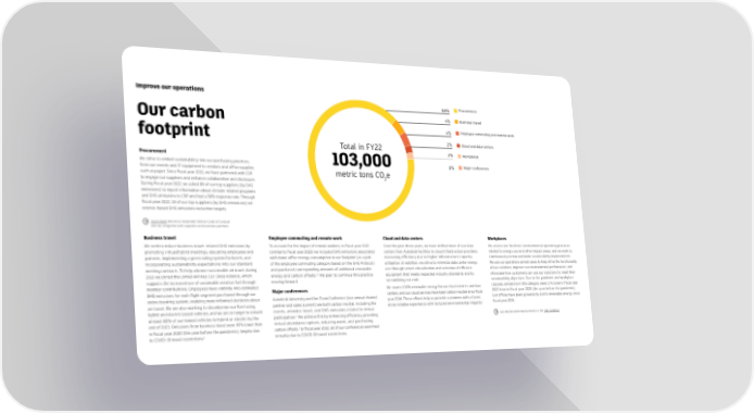 Improve our operations 88% Procurement Our carbon 4% Business travel footprint 4% Employee commuting and remote work Total in FY22 2% Cloud and data centers 2% Workplaces Procurement 103,000 We strive to embed sustainability into our purchasing practices, 0% Major conferences from our events and IT equipment to vendors and of昀椀ce supplies metric tons CO e such as paper. Since 昀椀scal year 2021, we have partnered with CDP 2 to engage our suppliers and enhance collaboration and disclosure. During 昀椀scal year 2022, we asked 89 of our top suppliers (by GHG emissions) to report information about climate-related programs and GHG emissions to CDP and had a 58% response rate. Through 昀椀scal year 2022, 18 of our top suppliers (by GHG emissions) set science-based GHG emissions reduction targets. Learn more about our expanded Partner Code of Conduct and our programs with suppliers and business partners. Business travel Employee commuting and remote work Cloud and data centers Workplaces We seek to reduce business travel–related GHG emissions by To account for the impact of remote workers, in 昀椀scal year 2022 Over the past three years, we have shifted more of our data We assess our facilities’ environmental operating practices promoting virtual/hybrid meetings, educating employees and (similar to 昀椀scal year 2021) we included GHG emissions associated centers from Autodesk facilities to cloud infrastructure providers, related to energy use and other impact areas, and we work to partners, implementing a green rating system for hotels, and with home of昀椀ce energy consumption in our footprint (as a part increasing ef昀椀ciency due to higher infrastructure capacity continuously review and make sustainability improvements. incorporating sustainability expectations into our standard of the employee commuting category based on the GHG Protocol) utilization. In addition, we strive to minimize data center energy We use our operations as test cases to help re昀椀ne the functionality meeting contracts. To help advance sustainable air travel, during and purchased corresponding amounts of additional renewable use through server virtualization and selection of ef昀椀cient of our solutions, improve our environmental performance, and 2021 we joined the United Airlines Eco-Skies Alliance, which 1,2 energy and carbon offsets. We plan to continue this practice equipment that meets respected industry standards and by showcase how customers can use our solutions to meet their supports the increased use of sustainable aviation fuel through moving forward. streamlining our code. sustainability objectives. Due to the pandemic and workplace member contributions. Employees have visibility into estimated Major conferences We source 100% renewable energy for our cloud services and data closures, emissions in this category were 37% lower in 昀椀scal year GHG emissions for each 昀氀ight segment purchased through our centers, and our cloud services have been carbon neutral since 昀椀scal 2022 than in 昀椀scal year 2020 (the year before the pandemic). online booking system, enabling more informed decisions about Autodesk University and One Team Conference (our annual channel year 2016. These efforts help us provide customers with a faster, Our of昀椀ces have been powered by 100% renewable energy since air travel. We are also working to decarbonize our 昀氀eet using partner and sales summit) are both carbon neutral, including the 1 昀椀scal year 2016. hybrid and electric leased vehicles, and we are on target to convert events, attendee travel, and GHG emissions related to virtual more reliable experience with reduced environmental impacts. 3 at least 80% of our leased vehicles to hybrid or electric by the participation. We achieve this by enhancing ef昀椀ciency, providing See detailed performance metrics in the Data summary. end of 2023. Emissions from business travel were 95% lower than virtual attendance options, reducing waste, and purchasing 1 in 昀椀scal year 2020 (the year before the pandemic), largely due carbon offsets. In 昀椀scal year 2022, all of our conferences were held 1 virtually due to COVID-19 travel restrictions. to COVID-19 travel restrictions.