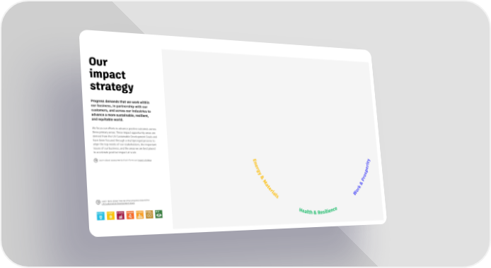 Our impact strategy Progress demands that we work within our business, in partnership with our customers, and across our industries to advance a more sustainable, resilient, and equitable world. We focus our efforts to advance positive outcomes across three primary areas. These impact opportunity areas are derived from the UN Sustainable Development Goals and have been focused through a multipronged process to align the top needs of our stakeholders, the important issues of our business, and the areas we arebestplaced to accelerate positive impact at scale. Learn about assessments that inform our impact strategy. Ene rity rgy spe &M Pro ateri rk& Learn more about how we drive progress toward the als Wo UN Sustainable Development Goals. Healt lience h& esi R