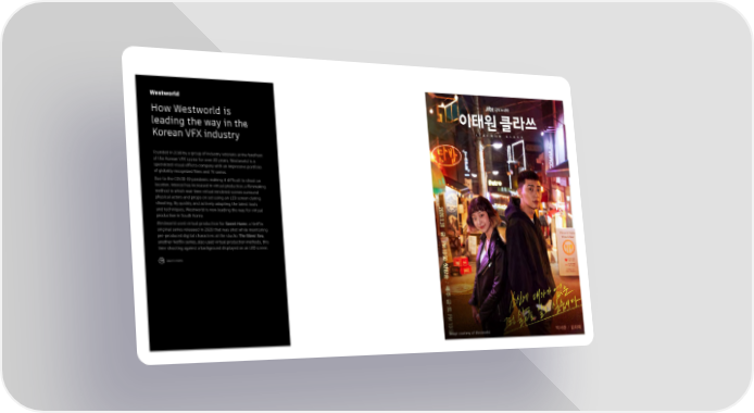 Westworld How Westworld is leading the way in the Korean VFX industry Founded in 2018 by a group of industry veterans at the forefront of the Korean VFX scene for over 20 years, Westworld is a specialized visual effects company with an impressive portfolio of globally recognized 昀椀lms and TV series. Due to the COVID-19 pandemic making it dif昀椀cult to shoot on location, interest has increased in virtual production, a 昀椀lmmaking method in which real-time virtual rendered scenes surround physical actors and props on set using an LED screen during shooting. By quickly and actively adopting the latest tools and techniques, Westworld is now leading the way for virtual production in South Korea. Westworld used virtual production for Sweet Home, a Net昀氀ix original series released in 2020 that was shot while monitoring pre-produced digital characters at the studio. The Silent Sea, another Net昀氀ix series, also used virtual production methods, this time shooting against a background displayed on an LED screen. Learn more Image courtesy of Westworld