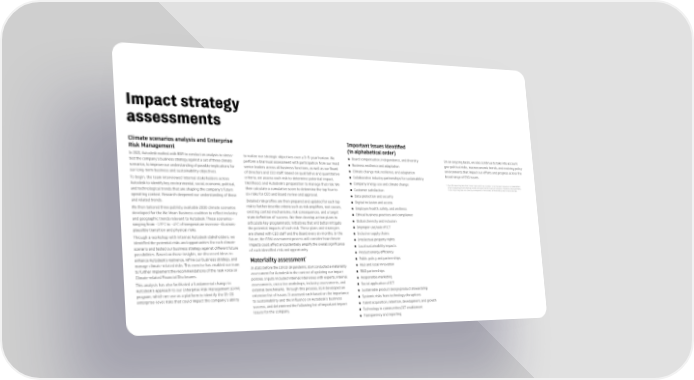 72 Impact strategy assessments Climate scenarios analysis and Enterprise Important issues identi昀椀ed Risk Management (in alphabetical order) In 2021, Autodesk worked with BSR to conduct an analysis to stress- to realize our strategic objectives over a 3–5-year horizon. We ● Board compensation, independence, and diversity On an ongoing basis, we also continue to take into account test the company's business strategy against a set of three climate perform a biannual assessment with participation from our most ● Business resilience and adaptation geo-political risks, macroeconomic trends, and evolving policy scenarios, to improve our understanding of possible implications for senior leaders across all business functions, as well as our Board ● Climate change risk, resilience, and adaptation environments that impact our efforts and progress across the our long-term business and sustainability objectives. of Directors and CEO staff. Based on qualitative and quantitative ● Collaborative industry partnerships for sustainability broad range of ESG issues. To begin, the team interviewed internal stakeholders across criteria, we assess each risk to determine potential impact, likelihood, and Autodesk's preparation to manage that risk. We ● Company energy use and climate change * Our ESG reporting describes those topics which we consider to be the most important to stakeholders Autodesk to identify key environmental, social, economic, political, when evaluating environmental, social, and governance issues at Autodesk. Therefore, ESG materiality and technological trends that are shaping the company's future then calculate a cumulative score to determine the top four to ● Customer satisfaction in our reporting does not directly correspond to the concept of materiality used in securities law. operating context. Research deepened our understanding of these six risks for CEO and Board review and approval. ● Data protection and security and related trends. Detailed risk pro昀椀les are then prepared and updated for each top ● Digital inclusion and access We then tailored three publicly available 2030 climate scenarios risk to further describe criteria such as risk ampli昀椀ers, root causes, ● Employee health, safety, and wellness developed for the We Mean Business coalition to re昀氀ect industry existing control mechanisms, risk consequences, and a target ● Ethical business practices and compliance and geographic trends relevant to Autodesk. These scenarios— state de昀椀nition of success. We then develop action plans to ● Global diversity and inclusion ranging from ~1.5°C to ~4°C of temperature increase—illustrate articulate key programmatic initiatives that will better mitigate plausible transition and physical risks. the potential impacts of each risk. These plans and strategies ● Improper use/sale of ICT Through a workshop with internal Autodesk stakeholders, we are shared with CEO staff and the Board every six months. In the ● Inclusive supply chains identi昀椀ed the potential risks and opportunities for each climate future, the ERM assessment process will consider how climate ● Intellectual property rights scenario and tested our business strategy against different future impacts could affect and potentially amplify the overall signi昀椀cance ● Local sustainability impacts possibilities. Based on those insights, we discussed ideas to of each identi昀椀ed risk and opportunity. ● Product energy ef昀椀ciency enhance Autodesk’s resilience, re昀椀ne our business strategy, and * ● Public policy and partnerships manage climate-related risks. This exercise has enabled our team Materiality assessment to further implement the recommendations of the Task Force on In 2020, before the COVID-19 pandemic, BSR conducted a materiality ● R&D and local innovation Climate-related Financial Disclosures. assessment for Autodesk in the context of updating our impact ● R&D partnerships This analysis has also facilitated a fundamental change in policies. Inputs included internal interviews with experts, internal ● Responsible marketing Autodesk’s approach to our Enterprise Risk Management (ERM) assessments, executive workshops, industry assessments, and ● Social application of ICT program, which we use as a platform to identify the 15–20 external benchmarks. Through this process, BSR developed an ● Sustainable product design/product stewardship enterprise-level risks that could impact the company’s ability extensive list of issues. It assessed each based on the importance to sustainability and the in昀氀uence on Autodesk’s business ● Systemic risks from technology disruptions success, and determined the following list of important impact ● Talent acquisition, retention, development, and growth issues for the company. ● Technology in communities/ICT enablement ● Transparency and reporting