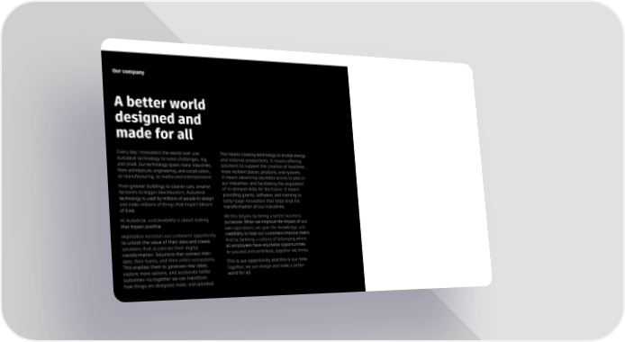 06 Our company A better world designed and made for all Every day, innovators the world over use This means creating technology to enable energy Autodesk technology to solve challenges, big and material productivity. It means offering and small. Our technology spans manyindustries, solutions to support the creation of healthier, from architecture, engineering, and construction, more resilient places, products, and systems. to manufacturing, to media and entertainment. It means advancing equitable access to jobs in From greener buildings to cleaner cars, smarter our industries–and facilitating the acquisition factories to bigger blockbusters, Autodesk of in-demand skills for the future. It means technology is used by millions of people todesign providing grants, software, and training to and make millions of things that impact billions early-stage innovation that helps lead the of lives. transformation of our industries. At Autodesk, sustainability is about making All this begins by being a better business that impact positive. ourselves. When we improve the impact of our own operations, we gain the knowledge and Digitization increases our customers’ opportunity credibility to help our customers improve theirs. to unlock the value of their data and create And by building a culture of belonging where solutions that accelerate their digital all employees have equitable opportunities transformation. Solutions that connect their to succeed and contribute, together we thrive. data, their teams, and their entire ecosystems. This is our opportunity and this is our time. This enables them to generate new ideas, Together, we can design and make a better explore more options, and accelerate better world for all. outcomes–so together we can transform how things are designed, made, and operated.