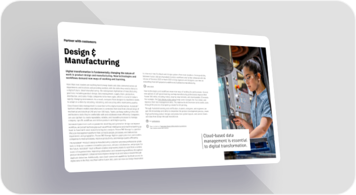 Partner with customers Design & Manufacturing Digital transformation is fundamentally changing the nature of to view real-time feedback and design updates from team members. Interoperability work in product design and manufacturing. New technologies and between Fusion 360 and Autodesk Inventor work昀氀ows was further enhanced with the work昀氀ows demand new ways of working and learning. release of Inventor 2023 in March 2022 to help engineers and designers save time on everything from BIM projects to additive and subtractive manufacturing. More than ever, leaders are working hard to keep teams and data connected across all Learn more departments and locations and providing workers with the skills they need to thrive in a digital future. Smart manufacturing—the widespread digitization of manufacturing New technologies and work昀氀ows mean new ways of working for professionals. Several practices, including product design, data management, supply chain, production, new options in self-paced learning can help manufacturing professionals improve their distribution, and sales—helps companies to be more agile, which is crucial in today’s Fusion 360 skills, including videos, step-by-step tutorials, and downloadable 3D models. rapidly changing environment. As a result, everyone from designer to machinist needs For example, the Tool Library video series helps users navigate the Tool Library and to adapt on a dime by retooling, retraining, and executing while maintaining quality. improve their tool management skills. The Additive Build Extension series walks users ® through the process of preparing a model for 3D printing. Cloud-based data management is essential to this digital transformation. Autodesk Upchain software enables manufacturers to centralize their data from a broad range of Through Autodesk learning and certi昀椀cation, students, designers, and engineers can mechanical and electrical CAD and non-CAD tools. Teams can keep working in the CAD gain the knowledge and skills to streamline the product development process, create and business tools they’re comfortable with and collaborate more ef昀椀ciently. Companies high-performing product designs and production system layouts, and connect teams can use Upchain to create repeatable, reliable, and traceable processes to manage and data from design through manufacture. company-speci昀椀c work昀氀ows and deliver products with higher quality. See Certi昀椀cations. Automated processes such as parametric modeling and generative design can improve work昀氀ow, and smart technologies such as arti昀椀cial intelligence and machine learning go See a summary of Autodesk Design & Manufacturing solutions hand-in-hand with smart manufacturing data analysis. Fusion 360 Manage is a product that enable sustainable design. lifecycle management platform that connects people, processes, and data across departments and geographies. Fusion 360 Manage digitizes paper processes and enables companies to track processes, improve productivity, and manage quality ef昀椀ciently. Cloud-based data ® Product Design & Manufacturing Collection provides professional-grade The Autodesk management is essential tools to help our customers streamline processes, enhance collaboration, and prepare for ® the future. Autodesk Vault software enables engineering teams to work from a central to digital transformation. source of organized data, improving collaboration and streamlining work昀氀ows throughout product development. Enhanced tools improve design reuse and reduce rework through duplicate detection. Additionally, new cloud-connected capabilities facilitate access to digital data in the 昀椀eld. And from within Fusion 360, users can now use Design Reservation