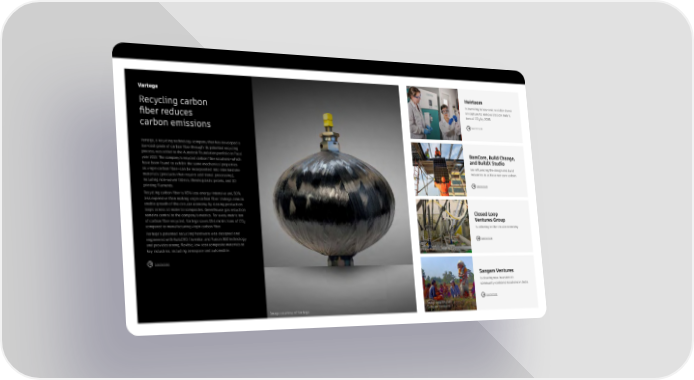 Vartega Heirloom is investing in low-cost, scalable direct Recycling carbon air capture to remove 1 billion metric fiber reduces tons of CO₂ by 2035. carbon emissions Learn more Vartega, a recycling technology company that has developed a low-cost grade of carbon fiber through its patented recycling BamCore, Build Change, process, was added to the Autodesk Foundation portfolio in fiscal and BuildX Studio year 2022. The company’s recycled carbon fiber solutions—which have been found to exhibit the same mechanical properties are influencing the design and build as virgin carbon fiber—can be incorporated into intermediate industries to achieve net-zero carbon. materials (products that require additional processing), including non-woven fabrics, thermoplastic pellets, and 3D Learn more printing filaments. Recycling carbon fiber is 95% less energy-intensive and 50% less expensive than making virgin carbon fiber. Vartega aims to enable growth of the circular economy by closing production loops across all material composites. Greenhouse gas reduction Closed Loop remains central to the company’s metrics. For every metric ton Ventures Group of carbon fiber recycled, Vartega saves 13.4 metric tons of CO₂ compared to manufacturing virgin carbon fiber. is ushering in the circular economy. Vartega’s patented recycling hardware was designed and engineered with AutoCAD, Inventor, and Fusion 360 technology Learn more and provides strong, flexible, low-cost composite materials to Image courtesy of Closed key industries, including aerospace and automobile. Loop Partners/AMP Robotics Learn more Sangam Ventures is drawing new investors to community-centered solutions in India. Learn more Image courtesy of Image courtesy of Vartega Sangam Ventures