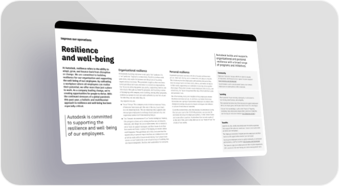 Improve our operations Resilience Autodesk builds and supports organizational and personal resilience with a broad range and well-being of programs and initiatives. At Autodesk, resilience refers to the ability to Organizational resilience Personal resilience Community adapt, grow, and bounce back from disruption At Autodesk, building resilience is not just a “me” problem. It’s Autodesk’s personal resilience initiative focuses on three main Employee Resource Groups, which are open to anyone or change. We are committed to building a “we” problem. Purposeful connections, flexibility on how work pillars: inner well-being, social connection, and physical health. at Autodesk, can help provide a space for peer support resilience for our organization and supporting gets done, and work-life balance are the pillars of building The initiative provides employees with learning resources they (see Diversity and belonging). the well-being of our employees. By cultivating organizational resilience. The pandemic taught us that resilience need to adapt, build resilience skills, thrive, and make an impact Slack channels such as #adsk-mindfulness also connect a workplace where all employees can realize is not just about self-care; resilience is a collective responsibility. in their work, supporting our customers in solving critical global employees to communities within Autodesk. their potential, we offer more than just a place Our focus on achieving gender pay parity, supporting families and challenges. These skills better equip employees individually, and to work. As a company leading change, we’re individuals through our benefits program, and building a sense collectively, for future disruptions that may affect both their work creating opportunities for people to thrive. With of belonging with company-wide learning, among other programs, and personal lives. Learning the continued stressors of a global pandemic enables our people to lead and work authentically and feel valued We offer training, tools, and insights to help employees master The Autodesk Pause learning community is dedicated to for who they are and what they do. the three resilience pillars. In addition, our Global Resilience well-being, mindfulness, and empathy. this past year, a holistic and multifaceted Key aspects include: Advocates are a group of passionate employee volunteers who approach to resilience and well-being has been champion learning resources to inspire colleagues and enhance The Autodesk Resilience site offers resources to support employees’ especially critical. ● Focus Fridays: This company-wide initiative reserves Friday ability to adapt, grow, and bounce back from life’s challenges. afternoons from noon until the end of the day (local time) a culture of resilience at Autodesk. as a no-meeting block. This no-meeting time supports and Given the extraordinary and challenging circumstances during Culture Code workshops, such as the Power of Empathy encourages employees to recharge, boost productivity, and the last year due to the COVID-19 pandemic, we provided 10 workshop, help employees deepen their practice of empathy Autodesk is committed experience some relief from meeting fatigue. additional holidays for employees globally. In the United States and develop an inclusive mindset (see Company culture). ● Flex Forward: An extension of Our Flexible Workplace Promise, and some other countries, Autodeskers had an extra week off to supporting the this program allows us to reimagine how we collaborate, at the end of the year during what we call our “Week of Rest” for innovate, and shape inclusive team norms. We’ve created a a total of two weeks. Benefits resilience and well-being set of tools to support managers and their teams to do their Benefits My Way reimburses employees for eligible expenses best work and foster a sense of belonging, no matter where that support their physical, emotional, financial, and sustainable of our employees. work happens. Through these activities, everyone has the wellness (see next page). opportunity to provide input into how we communicate and The Employee Assistance Program provides employeesand their prioritize work with a focus on well-being. Our Culture Code families with support when needed (see next page). serves as our foundation as we adapt to ways of working that are more transparent, flexible, and sustainable for everyone. Bravely gives employees access to a global community of on-demand professionally certified coaches (see Diversity and belonging). The Sanvello app gives employees and their eligible dependents (13+) access to free well-being and stress management tools.