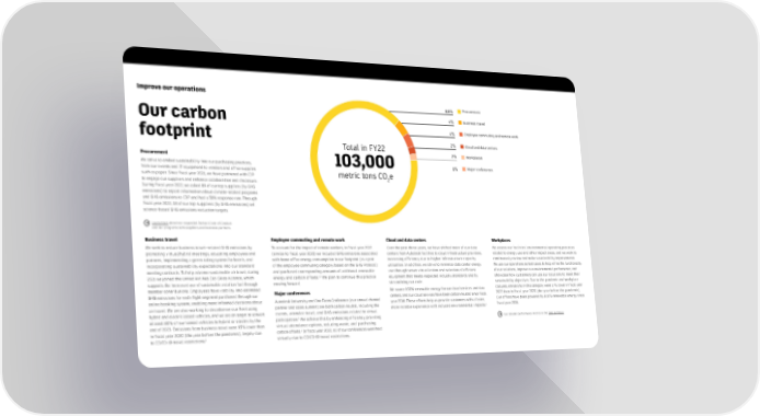 Improve our operations 88% Procurement Our carbon 4% Business travel footprint 4% Employee commuting and remote work Total in FY22 2% Cloud and data centers 2% Workplaces Procurement 103,000 We strive to embed sustainability into our purchasing practices, 0% Major conferences from our events and IT equipment to vendors and office supplies metric tons CO e such as paper. Since fiscal year 2021, we have partnered with CDP 2 to engage our suppliers and enhance collaboration and disclosure. During fiscal year 2022, we asked 89 of our top suppliers (by GHG emissions) to report information about climate-related programs and GHG emissions to CDP and had a 58% response rate. Through fiscal year 2022, 18 of our top suppliers (by GHG emissions) set science-based GHG emissions reduction targets. Learn more about our expanded Partner Code of Conduct and our programs with suppliers and business partners. Business travel Employee commuting and remote work Cloud and data centers Workplaces We seek to reduce business travel–related GHG emissions by To account for the impact of remote workers, in fiscal year 2022 Over the past three years, we have shifted more of our data We assess our facilities’ environmental operating practices promoting virtual/hybrid meetings, educating employees and (similar to fiscal year 2021) we included GHG emissions associated centers from Autodesk facilities to cloud infrastructure providers, related to energy use and other impact areas, and we work to partners, implementing a green rating system for hotels, and with home office energy consumption in our footprint (as a part increasing efficiency due to higher infrastructure capacity continuously review and make sustainability improvements. incorporating sustainability expectations into our standard of the employee commuting category based on the GHG Protocol) utilization. In addition, we strive to minimize data center energy We use our operations as test cases to help refine the functionality meeting contracts. To help advance sustainable air travel, during and purchased corresponding amounts of additional renewable use through server virtualization and selection of efficient of our solutions, improve our environmental performance, and 2021 we joined the United Airlines Eco-Skies Alliance, which 1,2 energy and carbon offsets. We plan to continue this practice equipment that meets respected industry standards and by showcase how customers can use our solutions to meet their supports the increased use of sustainable aviation fuel through moving forward. streamlining our code. sustainability objectives. Due to the pandemic and workplace member contributions. Employees have visibility into estimated Major conferences We source 100% renewable energy for our cloud services and data closures, emissions in this category were 37% lower in fiscal year GHG emissions for each flight segment purchased through our centers, and our cloud services have been carbon neutral since fiscal 2022 than in fiscal year 2020 (the year before the pandemic). online booking system, enabling more informed decisions about Autodesk University and One Team Conference (our annual channel year 2016. These efforts help us provide customers with a faster, Our offices have been powered by 100% renewable energy since air travel. We are also working to decarbonize our fleet using partner and sales summit) are both carbon neutral, including the 1 fiscal year 2016. hybrid and electric leased vehicles, and we are on target to convert events, attendee travel, and GHG emissions related to virtual more reliable experience with reduced environmental impacts. 3 at least 80% of our leased vehicles to hybrid or electric by the participation. We achieve this by enhancing efficiency, providing See detailed performance metrics in the Data summary. end of 2023. Emissions from business travel were 95% lower than virtual attendance options, reducing waste, and purchasing 1 in fiscal year 2020 (the year before the pandemic), largely due carbon offsets. In fiscal year 2022, all of our conferences were held 1 virtually due to COVID-19 travel restrictions. to COVID-19 travel restrictions.