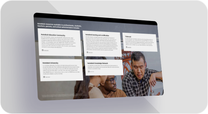 Autodesk resources available to professionals, students, teachers, parents, and school administrators include: Autodesk learning and certification Tinkercad Autodesk Education Community provides industry-validated skillbuilder courses and certifications for is a free web app for 3D design, electronics, and coding. With more than 45 professional users and students around the globe. Our certifications are ® ® provides students, faculty, and educational institutions the latest million registered users around the world, Autodesk Tinkercad software information on Autodesk product updates and certifications, as well as both product- and role-aligned, which helps recipients market their job builds STEM confidence by bringing project-based learning to the classroom. information regarding workforce readiness, teaching trends, industry readiness. This helps educators stay current on industry-adopted tools so Tinkercad is proud to bear the ISTE Seal of Alignment. Our lesson plans changes, and upcoming events and competitions. Students and educators they can teach more effectively. We offer learning pathways in architecture, adhere to ISTE, Common Core, and NGSS standards for the classroom. * engineering, and construction as well as product design and manufacturing, can also access Autodesk’s professional-grade software for free. In fiscal year 2022, millions of students and educators used Autodesk and introduced a full line of certifications for machinists and mechanical Learn more software to learn design and make skills. engineers in 2021. Millions of architects, mechanical engineers, and design professionals worldwide benefit from an Autodesk Certification. Learn more Learn more Autodesk University Autodesk Knowledge Network is a learning community for design and engineering professionals from is a repository of more than a million contributions from Autodesk, its around the globe and offers conference experiences and free access to online community, and its partners, and includes more than 250 videos and articles learning resources year-round. In fiscal year 2022, the Autodesk University related to sustainable design. website received more than 2.4 million visits, and users watched more than 133,000 hours of instructional video, as well as 29,500 hours on other Learn more distribution channels such as YouTube. Learn more * Free Autodesk software and/or cloud-based services are subject to acceptance of and compliance with the terms and conditions of the terms of use and/or other terms that accompany such software or cloud-based services. Software and cloud-based services subject to an Educational license or subscription may be used by eligible users solely for Educational Purposes and shall not be used for commercial, professional, or any other for-profit purposes.