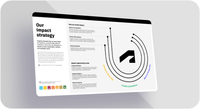 How we create impact Our Improve our operations Advance sustainable business practices, set the standard in our culture, governance, and operations, and align and activate impact diverse employees to make a positive impact at work strategy Partner with customers Empower customers to harness data, automation, and insights to improve the impact of design and make decisions– Progress demands that we work within advancing a more sustainable, resilient, and equitable world our business, in partnership with our customers, and across our industries to Advance industries advance a more sustainable, resilient, Accelerate industry transformation through cross-sector and equitable world. collaboration, policy advocacy, and by catalyzing innovation between and beyond our industries We focus our efforts to advance positive outcomes across three primary areas. These impact opportunity areas are derived from the UN Sustainable Development Goals and have been focused through a multipronged process to align the top needs of our stakeholders, the important issues of our business, and the areas we arebestplaced to accelerate positive impact at scale. Impact opportunity areas Learn about assessments that inform our impact strategy. Energy & Materials Ene ity Enable better energy and material choices, reducing carbon r r emissions and waste. Encompasses key aspects related to g e energy, materials, waste, and supply chain. y sp Health & Resilience &M Pro Accelerate the design and make of places and products a that are safer, healthier, and more resilient. Encompasses te & key aspects related to safety, health, well-being, resilience, ri rk and adaptation. als o Learn more about how we drive progress toward the W UN Sustainable Development Goals. Work & Prosperity Facilitate the acquisition of in-demand skills and lifelong learning to meet the workforce needs of our industries. Encompasses key aspects related to diversity, inclusion, Heal ence mindset, skills, and learning. th & esili R