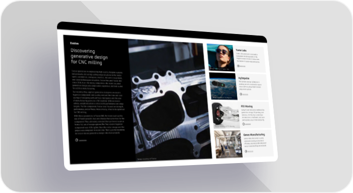 Evolve Yuma Labs Yuma Labs produces sustainable sunglasses and brings some of the Discovering biggest names in street fashion into generative design its mission of closed-loop production. for CNC milling Learn more Image courtesy of Yuma Labs Evolve specializes in engineering high-quality bespoke systems HyImpulse and products, delivering cutting-edge solutions to the motor sport, automotive, aerospace, medical, industrial equipment, The German startup HyImpulse is and clean technologies industries. Evolve has used Fusion 360 working on safe, sustainable space since 2016, but—like many companies—the team assumed travel with its unique hybrid rocket generative design was complicated, expensive, and best suited propulsion system. for additive manufacturing. But recently they applied generative design to an electric Learn more hypercar component and quickly realized the time and cost Image courtesy of Hyimpulse savings of designing with artificial intelligence and the ease of manufacturing parts on a CNC machine. With an electric vehicle, weight reduction is critical to hit performance and range PIX Moving targets. For the component, Evolve also focused on strength, performance, and stiffness. Most critically, it had to be optimized Using AI and innovative methods like for CNC milling. generative design, 3D printing, and With these parameters in Fusion 360, the team could quickly robotics, PIX Moving is creating a see different possibilities and choose their priorities for the decentralized, distributed, and user- component. They ultimately selected their preferred solution participatory way of manufacturing. from a full set of design options.The final electric hypercar Learn more component was 40% lighter than the initial design and the Image courtesy of PIX Moving project was completed in record time. That’s just the beginning as Evolve moves generative design into more projects. Learn more Ganas Manufacturing Ganas Manufacturing is using automated nesting to maximize efficiency and reduce the amount of scrap in woodworking and millwork. Learn more Image courtesy of Evolve Image courtesy of GANAS MFG