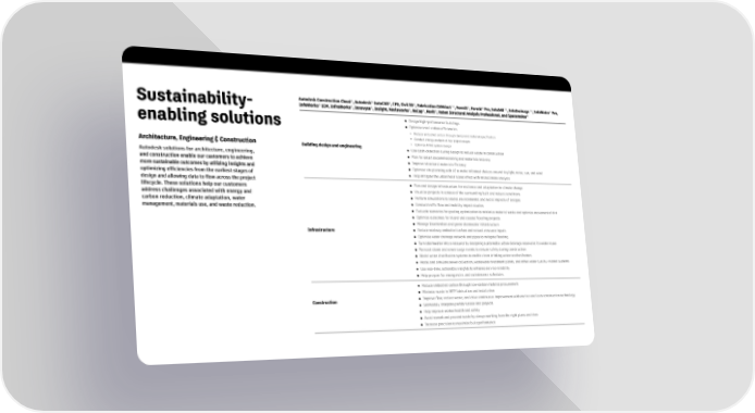 ® ® ® ® ® ® ® Autodesk Construction Cloud , Autodesk AutoCAD , CFD, Civil 3D , Fabrication CAMduct™, FormIt , FormIt Pro, Info360™, InfoDrainage™, InfoWater Pro, ® ® ® ® ® ® ® Sustainability- InfoWorks ICM, InfraWorks , Innovyze , Insight, Navisworks , ReCap , Revit , Robot Structural Analysis Professional, and Spacemaker ● Design high-performance buildings enabling solutions ● Optimize total carbon efficiencies • Reduce embodied carbon through design and material specification • Conduct energy analysis at key project stages Architecture, Engineering & Construction Building design and engineering • Optimize HVAC system design ● Use clash detection during design to reduce waste in construction Autodesk solutions for architecture, engineering, ● Plan for smart decommissioning and materials recovery and construction enable our customers to achieve ● Improve structural material efficiency more sustainable outcomes by utilizing insights and ● Optimize site planning with AI to make informed choices around daylight, noise, sun, and wind optimizing efficiencies from the earliest stages of ● Help mitigate the urban heat island effect with microclimate analysis design and allowing data to flow across the project ● Plan and design infrastructure for resilience and adaptation to climate change lifecycle. These solutions help our customers ● Visualize projects in context of the surrounding built and natural conditions address challenges associated with energy and ● Perform simulations to assess environmental and social impacts of designs carbon reduction, climate adaptation, water ● Conduct traffic flow and mobility impact studies management, materials use, and waste reduction. ● Evaluate scenarios for grading optimization to minimize material waste and optimize movement of dirt ● Optimize outcomes for inland and coastal flooding projects ● Manage bioretention and green stormwater infrastructure Infrastructure ● Reduce roadway embodied carbon and natural resource inputs ● Optimize water drainage network and pipes to mitigate flooding ● Turn stormwater into a resource by designing sustainable urban drainage reservoirs for water reuse ● Forecast storm and sewer surge events to ensure safety during construction ● Model water distribution systems to enable clean drinking water reaches homes ● Model and simulate sewer collection, wastewater treatment plants, and other water quality–related systems ● Use real-time, actionable insights to enhance service reliability ● Help prepare for emergencies and maintenance schedules ● Reduce embodied carbon through low-carbon material procurement ● Minimize waste in MEP fabrication and installation Construction ● Improve flow, reduce waste, and drive continuous improvement with end-to-end lean construction technology ● Seamlessly integrate prefabrication into projects ● Help improve worker health and safety ● Avoid rework and prevent waste by always working from the right plans and docs ● Increase precision to maximize built performance