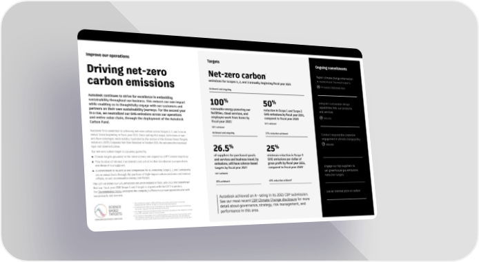 Improve our operations Targets Ongoing commitments * Report climate change information Driving net-zero Net-zero carbon in mainstream financial reports carbon emissions emissions for Scopes 1, 2, and 3 annually, beginning fiscal year 2021 See Autodesk FY2022 Annual Report Achieved and ongoing Autodesk continues to strive for excellence in embedding % % Integrate sustainable design sustainability throughout our business. This reduces our own impact 100 50 capabilities into our products while enabling us to thoughtfully engage with our customers and renewable energy powering our reduction in Scope 1 and Scope 2 and services partners on their own sustainability journeys. For the second year facilities, cloud services, and GHG emissions by fiscal year 2031, in a row, we neutralized our GHG emissions across our operations employee work from home by compared to fiscal year 2020 Learn more and entire value chain, through the deployment of the Autodesk † Carbon Fund. fiscal year 2021 SBTi validated SBTi validated Autodesk first committed to achieving net-zero carbon across Scopes 1, 2, and 3 on an Achieved and ongoing 37% reduction achieved Conduct responsible corporate annual basis beginning in fiscal year 2021. Since setting this target, definitions of net- engagement in climate change policy zero have converged; most notably illustrated by the release of the Science Based Targets initiative’s (SBTi) Corporate Net-Zero Standard in October 2021. We welcome this increased Learn more rigor and standardization. % % Our net-zero carbon target is a journey guided by: 26.5 25 ● Climate targets grounded in the latest science and aligned to a 1.5˚C climate trajectory of suppliers for purchased goods minimum reduction in Scope 3 ● Prioritization of internal investments and activities that decarbonize our operations and services and business travel, by GHG emissions per dollar of and those of our suppliers emissions, will have science-based gross profit by fiscal year 2031, ‡ Engage our top suppliers to ● A commitment to neutralize and compensate for all remaining Scope 1, 2, and 3 emissions targets by fiscal year 2027 compared to fiscal year 2020 on an annual basis through the purchase of high-impact carbon avoidance and removal SBTi validated set greenhouse gas emissions offsets, as well as renewable energy certificates. reduction targets The SBTi validated our GHG emissions reduction targets in fiscal year 2022 and determined 15% achieved 67% reduction achieved§ that our fiscal year 2031 Scope 1 and 2 target is aligned with the 1.5˚C trajectory. Our Environmental Policy underpins the company’s efforts in our own operations and with our products and services. Autodesk achieved an A- rating in its 2021 CDP submission. Use an internal price on carbon * Since setting this target in 2020, definitions of net-zero carbon have increasingly See our most recent CDP Climate Change disclosure for more standardized. We continue to align our activities with best practice. † To estimate home office energy consumption, we follow the Work from Home methodology “No Survey” approach that was developed by Anthesis. detail about governance, strategy, risk management, and ‡ This target covers all of Autodesk’s Scope 3 emissions, expanding on the categories included in our SBTi-validated Scope 3 emissions target. performance in this area. § This reduction was largely due to a 93% decrease in GHG emissions from business travel and employee commuting as a result of COVID-19 travel restrictions. We anticipate an increase in business travel-related and overall Scope 3 GHG emissions in the coming years.