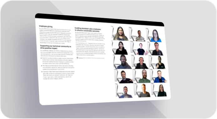 Employee giving Enabling Autodesk sales employees In a year when many organizations and individuals needed extra to advance sustainable outcomes support, Autodesk employees responded by donating record The Autodesk Making the Future sales incentive program amounts to nonprofits around the world. Employees receive 1:1 rewards Autodesk sales teams for partnering with customers to matching funds from the Autodesk Foundation, doubling the achieve outcomes aligned with the United Nations Sustainable impact of their charitable giving to communities and causes they Development Goals. Winners in fiscal year 2022 spanned account care about most. During 2021, the yearly matching cap was sizes and industries, and included Cemex, Compesa, Iberdrola, increased from $3,000 to $5,000, and specific crisis response and Setty & Associates. causes received a 2:1 match, such as assistance after Tropical Our Sustainability G.O.A.L. Program equips our customer-facing Storm Grace in Haiti and COVID-19 relief in India. employees with information, resources, and skills to support Supporting our technical community to customers on their sustainability journeys and create positive drive positive impact impact with the Autodesk technology platform. During 2021, the program grew to more than 300 employees and executives As a technology company, our technical employees play a pivotal from across the company, representing sales and customer role in driving impact. We offer incentives to engage their critical success as well as marketing, brand, business development, and and emerging skills, and we encourage innovative thinking that other groups from all regions globally. motivates and effects positive change in the world: ● As part of our annual technical summit, we give a Better World Learn more about our employees’ connection to giving and community. Builder Award—selected from nominees across the company— for outsized contribution toward helping our customers design and make a better world using Autodesk technology. ● The Employee patent program incentivizes creative thinking and sustainable innovation; employees who have new patents granted are given bonuses of up to $2,000. ● Autodesk's Impact Team rewards employees across the company who make exceptional contributions related to climate change. These individuals are awarded “Autobucks” and “Applause Points,” spot cash, or other non-monetary awards and recognition on the company intranet.