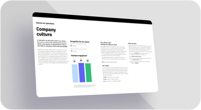 Improve our operations Company culture At Autodesk, we take great pride in our culture. Recognition for our culture Our culture code— Ways we work Our success comes from unlocking the passion, Newsweek “Most Loved Workplace” list (2021) putting our values to work The Ways We Work describe the principles that guide our decision talents, and expertise of all Autodeskers, who in Learn more The Autodesk Culture Code expresses our Values and the Ways making and underlay our policies and procedures. They help us turn help our customers achieve the new possible. We Work that make us a Customer Company. It puts our culture understand how we operate as team members, as departments, Glassdoor “Best Places to Work” list #21 (2022) into meaningful, actionable terms and is embedded into and as a company. The Ways We Work help build a rich We believe our strong company culture, including our diversity performance evaluations, recognition programs, and company-wide understanding of what we expect of ourselves and our colleagues. and belonging programs, continues to contribute to a lower Learn more learning. By harnessing the power of our culture, we deliver a ● We act as one Autodesk to get the best results for our turnover rate as compared to our Worldwide Software Products world-class employee experience, partnering with and enabling customers, our business, and our employees. & Services industry peers. Overall turnover for Autodesk in fiscal * our people to thrive and realize their potential. ● We empower decision makers. year 2022 was 14.0%, including both voluntary and involuntary Employee engagement exits, compared to an industry benchmark of 19.5% during an Empowered employees help our customers achieve better ● We actively foster an environment where people can bring overlapping time period (June 1, 2020 to June 1, 2021). This FY21 FY22 outcomes for their products, their businesses, and the world. their authentic selves to work. FY20 83 82 placed us around the 25th percentile. Our voluntary turnover rate 79 Behind Scenes of Autodesk’s Culture Code ● We hold ourselves to the highest ethical standards by in fiscal year 2022 was 11.1%, compared with the 50th percentile embodying integrity. 1 of 13.7%. Our values Our Values define how we at Autodesk work, both as individuals and as a company, and express the essence of who we are. They bring clarity to what we believe and what we expect of those who work with us. Our Values are organized around how we think, how we feel, and what we do. They guide and inspire our choices, mindsets, and actions. ● Think – Smart, innovative, adaptable ● Feel – Inclusive, impactful, humble ● Do – Courageous, accountable, pragmatic * Represents the average employee engagement score over three pulses during a given fiscal year. The engagement score is on a scale of 1–100 measuring the average outcome of two questions, eSat and Recommend. These data are reported on a calendar year basis. Fiscal year 2022 corresponds to calendar year 2021, and so forth.