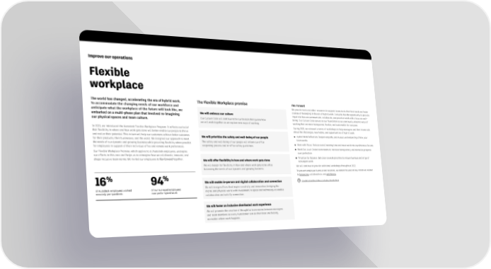 Improve our operations Flexible workplace The world has changed, accelerating the era of hybrid work. The Flexible Workplace promise Flex Forward To accommodate the changing needs of our workforce and We provide tools and other resources to support teams to do their best work and foster anticipate what the workplace of the future will look like, we We will embrace our culture a sense of belonging in the era of hybrid work. Everyone has the opportunity to provide embarked on a multi-phase plan that involved re-imagining input into how we communicate, collaborate, and prioritize work with a focus on well- our physical spaces and team culture. Our Culture Code will continue to be our beacon that guides how being. Our Culture Code serves as our foundation as we continually adapt to ways of we will work together as we explore new ways of working. working that are more transparent, flexible, and sustainable for everyone. In 2021, we introduced the Autodesk Flexible Workplace Program. It reflects our belief During 2021, we released a series of workshops to help managers and their teams talk that flexibility in where and how work gets done will better enable our people to thrive about the challenges, new habits, and opportunities of hybrid work: and realize their potential. This in turn will help our customers achieve better outcomes We will prioritize the safety and well-being of our people ● Hybrid Work Reflection: Deepen empathy and mutual understanding of how your for their products, their businesses, and the world. We designed our approach to meet team works the needs of our dynamic and growing business while providing flexibility where possible The safety and well-being of our people will inform our office ● Meet with Focus: Reduce overall meeting time and move work into asynchronous forums for employees in support of their individual office and remote work preferences. reopening process and in-office safety guidelines. Our Flexible Workplace Promise, which applies to all Autodesk employees, underpins ● Work Out Loud: Create team norms to increase transparency and normalize progress our efforts in this area and helps us to reimagine how we collaborate, innovate, and over perfection shape inclusive team norms. We invited our employees to flex forward together. We will offer flexibility in how and where work gets done ● Prioritize for Balance: Get clear on work priorities to reduce burnout and let go of nonurgent work We will design for flexibility in how and where work gets done while We will continue to provide additional workshops throughout 2022. balancing the needs of our dynamic and growing business. To prevent employee burnout and isolation, we remain focused on key initiatives related % % to belonging, collaboration, and well-being. 16 94 We will enable in-person and digital collaboration and connection How Autodesk Uses Culture to Deploy Flexible Work of Autodesk employees worked of our surveyed employees We will design offices that inspire creativity and innovation, bridging the remotely pre-pandemic now prefer hybrid work digital and physical world with investment in space and technology to enable collaboration and solidify connection. We will foster an inclusive distributed work experience We will promote the creation of thoughtful team norms between managers and team members so every Autodesker can do their best and belong, no matter where work happens.