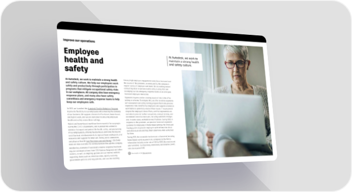 Improve our operations Employee At Autodesk, we work to maintain a strong health health and and safety culture. safety At Autodesk, we work to maintain a strong health Already high employee engagement scores have increased over and safety culture. We help our employees work the course of the pandemic, as measured by the company’s safely and productively through participation in regular survey of employee sentiment. We are working toward programs that mitigate occupational safety risks conducting more in-person events safely during 2022 and in our workplaces. All company sites have emergency revamping our site emergency response teams as we anticipate response plans, and many also have safety increased employee interaction. committees and emergency response teams to help Ergonomic injuries can be a leading source of risk, in the office keep our employees safe. setting or at home. To mitigate this, we offer an online ergonomic self-assessment and safety training program that tracks personal ergonomic risks identified by employees and suggests alternative In 2021, we launched the Autodesk Flexible Workplace Program, work habits to potentially resolve those issues. If issues persist to provide flexibility to our employees while meeting the demands despite the employee’s best efforts, certified ergonomists are of our business. We support a blend of office-based, home-based, available to provide further evaluations, conduct training, and and hybrid work, and we are dedicated to ensuring employee recommend corrective measures, including work habit changes health and safety across these settings. and, in some cases, workstation modifications. During 2021, in Hybrid and home-based work have been essential for our people response to the pandemic, we provided increased ergonomic during the COVID-19 pandemic, and Autodesk has worked to guidance for employees in home-based settings. We introduced minimize its impact and protect the health, safety, and productivity buying guides to provide employees with information about of our employees by offering flexible hours, additional holidays to available solutions and help them determine what works best avoid burnout, reimbursements to improve home workspaces, and for them. resources and support for inner well-being, social connection, During 2021, the recordable incident rate at Autodesk (including and physical health (see Resilience and well-being). COVID-19 home-based work) equaled 0.00, compared to the NAICS tests are now available for reimbursement through the company. information industry sector rate of 0.8 for 2020 (the most recent Another key element of Autodesk’s internal response has been year available). Our days away, restrictions, and transfers (DART) regular communications from CEO Andrew Anagnost and other rate also equaled 0.00. leaders, as well as ongoing updates on our internal website See details in the Data summary. regarding items such as infection rates, rapidly evolving government policies and regulations, and vaccine tracking.