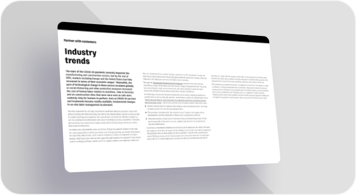 Partner with customers Industry trends The start of the COVID-19 pandemic severely impacted the they are. Autodesk offers valuable industry credentials to AEC and product design and work they do. People who find purpose in their jobs are more productive, healthier, more 5 manufacturing and construction sectors, but by the end of manufacturing professionals to bridge the gap between education and industry, ensuring resilient, and more likely to remain with their employer. Companies that succeed in the 2021, markets including Europe and the United States had fully employers and employees are ready for what’s next in industry. competition for talent will be those who help employees find purpose on the job. 3 Through the Membership Training Provider Program, Autodesk offers the national The pandemic has upended many prior assumptions, but the need for humans to adopt recovered in terms of their economic output. Meanwhile, the pace of technological change in these sectors escalated globally leadership of major North American trade unions a range of program benefits—including a mindset of lifelong learning has only accelerated. Employees in manufacturing and as social distancing and other protective measures increased low-cost software license fees—to train, test, and certify registered union and trade construction will prosper by acquiring the most in-demand technical and non-technical the cost of human labor relative to machines. Jobs in factories association members to help them advance their industry credentials. skills and by adapting to ever-changing roles in a competitive global economy. and on construction sites that were once seen as safe were As technology evolves and industries transform, we can expect ongoing adaptation of Employers who invest in their workforce and provide the necessary support for employees current roles as well as new job creation. According to a report we commissioned titled to connect to purpose at work are most likely to succeed in this new future of work. suddenly risky for humans to perform. Even as COVID-19 vaccines “Skilled Beyond Degree: How Experience Is Outpacing Education in Construction and and treatments became readily available, fundamental changes Manufacturing Hiring,” certain roles and skills will be most coveted in the near future: in on-site labor management accelerated. ● Demand remains high for sophisticated technical and non-technical skills—including an ongoing need for data and management skills. Industry responded by utilizing cloud-based workflows wherever possible. Across AEC, ● The pandemic demonstrated the essential role of logistics and supply chain product design and manufacturing, and media and entertainment, leaders quickly pivoted management, and the importance of these fields is projected to continue. to remote working environments and cloud-based collaboration. Workers adapted as ● Renewable energy-related roles in manufacturing are among those poised for the well by learning new technologies and ways of working as quickly as possible. Even jobs greatest growth in the next five years, emphasizing the need for adaptation to that were hard to transition to remote work shifted to help ensure safety on factory relevant technologies. floors and building sites. But many early adjustments were quick fixes. To help futureproof workers in the long In addition, a heightened emphasis on priorities such as employee well-being, resilience, run, new approaches to skills acquisition and lifelong learning are needed. Businesses and purpose can be key for organizations looking to recruit and retain skilled employees. are exploring innovations such as micro credentials (often accompanied by digital The pandemic has led many people to reevaluate their lives and work; according to a 4 recent McKinsey study on individual purpose and associated work and life outcomes, badges) that help close internal skills gaps through targeted development —and digital nearly half of US-based employees surveyed say they are reconsidering the kind of career coaching platforms, which use AI to support workers and employers wherever