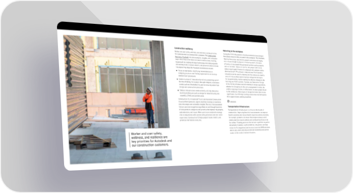 Construction resiliency Returning to the workplace Worker and user safety, wellness, and resilience are key priorities During the COVID-19 pandemic, health recommendations changed for Autodesk and our construction customers. The Construction how people moved as they returned to the workplace. TheInfraWorks Resiliency Playbook includes examples, insights, and actionable Mobility Simulation tool models people’s movement, bringing steps about how to be more resilient in construction, covering data-driven insight to physical distancing needs and more issues such as creating stronger technology and data programs efficiency of movement through transit centers such as airports and making teams, business models, and processes more resilient. and rail stations. Indoor air quality and proper ventilation Futureproofing steps the Playbook recommends include: make a significant difference for employee and customer safety. ® ● Focus on standards, identifying inconsistencies in With Autodesk CFD software, computational fluid dynamics company practices and finding opportunities to develop simulation can be used for thermal and flow analysis to identify standardized procedures. areas of risk and then explore multiple mitigation strategies ● Create a culture of innovation by actively promoting out-of- for occupant safety—before making any physical changes to the the-box thinking, for example through company-sanctioned building and HVAC systems. Dynamo and Generative Design events such as a hackathon focused on reducing waste from in Revit bring informed decision making to design exploration, design and construction processes. whether for designing for the safe arrangement of desks, the width or spacing of aisles, or other needs. As more people return ● Embrace industrialized construction by utilizing innovative to the workplace, these types of design decisions take on new building techniques such as design for manufacturing and significance. Our offerings can help create more resilient spaces assembly (DfMA) and prefabrication. that support teams working anywhere. ® Construction IQ, in Autodesk Build and Autodesk Construction Cloud platform products, applies machine learning to transform Learn more data into simple and actionable insights. The daily risk assessment Transportation infrastructure feature uses text recognition algorithms to sort through hundreds of data points to categorize and prioritize the highest risk projects, Transportation infrastructure is critical to the health of subcontractors, and issues. When used as an assistant to manage communities. Improving these built environments can improve risk in conjunction with current safety processes and real-world health outcomes and reduce health disparities among residents; experience, Construction IQ helps project teams identify and for example, planners can ensure that major roadways aren’t prioritize risk factors every day. constructed too close to schools and communities more at risk for asthma. Planning processes that include capabilities to predict movement of people—such as Mobility Simulation—can help reduce traffic congestion (and decrease associated GHG emissions Worker and user safety, and air pollution) and ensure safe and accessible evacuation routes in the event of natural disasters. wellness, and resilience are key priorities for Autodesk and our construction customers.