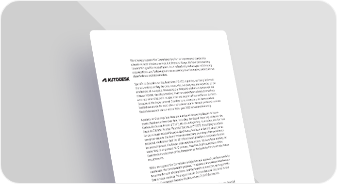 1 Please also refer to Autodesk's comment on question 13 in the FASB Invitation to Comment ("ITC") Agenda Consultation We strongly support the Commission's effort to improve and standardize climate-related disclosures in public financial filings. We have been working toward this goal for several years, both individually and as a part of advocacy organizations, and believe greater transparency is an increasing priority for our shareholders and stakeholders. Specific to Greenhouse Gas Emissions ("GHG") reporting, we firmly believe in the value of collecting the data, measuring our progress, and reporting on the attainment of our goals. Measuring our footprint enables us to manage our climate impact, thereby providing investors and other stakeholders with an accurate view of climate-related risks and opportunities within our business. Because of the importance of this data to our investors, we have received limited assurance for most of our emissions data for several years and received limited assurance for our entire fiscal year 2022 emissions inventory. A particular challenge has been the number of competing disclosure frame- works that have arisen over time, including the Global Reporting Initiative, the Carbon Disclosure Project (“CDP”), the Value Reporting Foundation, and the Task Force on Climate-Related Financial Disclosure (“TCFD”). Identifying standards for our climate-related financial disclosures has been a shifting target, so we see great value in the Commission standardizing on a single framework in its proposal. We believe that the TCFD framework provides a reasonable balance between improved disclosure and compliance costs. We have been working for some time to implement TCFD and are, therefore, highly supportive of the Commission’s selection of this framework as the basis for its climate disclosure requirements. While we support the Commission’s objective and approach, we have carefully considered the Commission’s proposal. To achieve a more reasonable balance between the cost of compliance and the benefit to investors, we suggest the Commission consider the suggestions in the remainder of this letter in two areas: 1) proposed financial disclosures and 2) GHG disclosures. Proposed Financial Disclosures Rather than the proposed new audited footnote disclosure within the financial statements, we believe the Commission should direct the Financial Accounting Standards Board (“FASB”) to add a project to their agenda that would focus on proposing disclosure requirements that enhance existing U.S. Generally Accept- ed Accounting Principles ("U.S. GAAP") for climate-related events, transactions, transition activities, and estimates in the audited financial statement footnotes. 1 With respect to a company’s climate-related financial impact, expenditures, estimates, and assumptions, we also agree with the Commission’s suggestion in Question 89 that disclosure of such information could reasonably be made outside the financial statements and within the proposed separately captioned item in the specified forms. We also suggest it be done on a prospective basis. --.:I AUTODESK in 2021 regarding the treatment of ESG-related transactions available at https://www.fasb.org/document/blob?file- Name=AGENDACONSULT.ITC.078.AUTODESK%20INC.%20STEPHEN%20HOPE,O.pdf