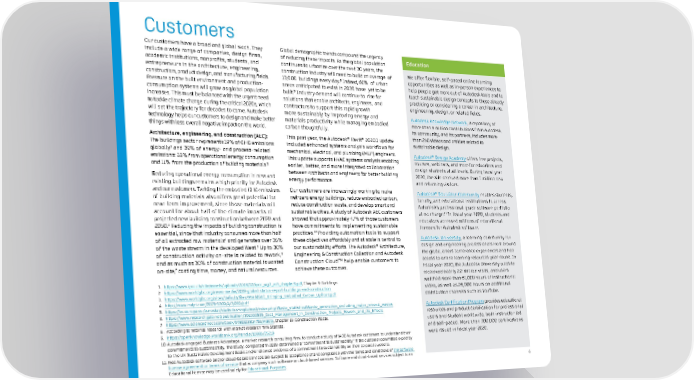 4 Customers Our customers have a broad and global reach. They include a wide range of companies, design firms, academic institutions, nonprofits, students, and entrepreneurs in the architecture, engineering, construction, product design, and manufacturing fields. Pressure on the built environment and production- consumption systems will grow as global population increases. This must be balanced with the urgent need to tackle climate change during the critical 2020s, which will set the trajectory for decades to come. Autodesk technology helps our customers to design and make better things with less overall negative impact on the world. Architecture, engineering, and construction (AEC): The buildings sector represents 19% of GHG emissions globally 1 and 39% of energy- and process-related emissions: 28% from operational energy consumption and 11% from the production of building materials. 2 Reducing operational energy consumption in new and existing buildings remains a high priority for Autodesk and our customers. Tackling the embodied GHG emissions of building materials also offers great potential for near-term improvement, since those materials will account for about half of the climate impacts of projected new building construction between 2020 and 2050. 3 Reducing the impacts of building construction is essential, since that industry consumes more than half of all extracted raw materials 4 and generates over 36% of the waste stream in the developed West. 5 Up to 30% of construction activity on-site is related to rework, 6 and as much as 30% of construction material is wasted on-site, 7 costing time, money, and natural resources. Global demogra phic trends compound the urgency of reducing these impacts. As the global population continues to urbanize over the next 30 years, the construction in dustry will need to build an average of 13,000 buildings every day. 8 Indeed, 60% o f urban areas anticipated to exist in 2 030 have y et to be built. 9 Industry dema nd will contin ue to rise for solutions that enable architec ts, engineers, a nd contractors to support this ra pid growth more sustainably by improving energy and ma ter ials productiv ity while managing embodied carbon thoughtfully. T his past year, the Autodesk ® Revit ® 2020.1 updat e included enha nced systems an alysis workflows for mechanical, electrical, and plumbing (MEP) engin eers. This update supports HVAC systems analysis enabling ear li er, better, and more integrated collaboration between architects and engineers for better building energy performa nce. Our customers are increasingly working to make net-zero energy buildings, reduce embodied c arbon, reduce construction waste, and develop smart and sustainable cities. A study of Autodesk AEC c ustomers showed that approximately 47% of those customers h ave commitments to implementing sustainable practices. 10 Providing automa tion tools to support these objecti ves affordably and at scale is central to our sustainabi lity efforts. The Autodesk ® Ar chitecture, En gineeri ng & Construction Collection and Autodesk Construction Cloud™ help enable customer s to achieve these outcomes. Education We offer flexible, self-paced online learning opportunities as well as in-person experiences to help people get more out of Autodesk tools and to teach sustainable design concepts to those already practicing or considering a career in architecture, engineering, design, or related fields. Autodesk Knowledge Network , a repository of more than a million contributions from Autodesk, its community, and its partners, includes more than 250 videos and articles related to sustainable design. Autodesk ® Design Academy offers free projects, courses, webinars, and more for educators and design students at all levels. During fiscal year 2020, the site received more than 1 million new and returning visitors. Autodesk ® Education Community enables students, faculty, and educational institutions to access Autodesk’s professional-grade software portfolio at no charge. 11 In fiscal year 2020, students and educators accessed millions of educational licenses for Autodesk software. Autodesk University , a learning community for design and engineering professionals from around the globe, offers conference experiences and free access to online learning resources year-round. In fiscal year 2020, the Autodesk University website receieved nearly 2.2 million visits, and users watched more than 61,000 hours of instructional video, as well as 26,000 hours on additional distribution channels such as YouTube. Autodesk Certification Program provides educational resources and product certification for professional users and student worldwide, both instructor-led and self-paced. More than 700,000 certifications were issued in fiscal year 2020. 1. https://www.ipcc.ch/site/assets/uploads/2018/02/ipcc_wg3_ar5_chapter9.pdf , Chapt er 9: Buildings. 2 https: //www.worldgbc.org/news-media/2019-global-status-report-buildings-and-construction 3. https: //www.worldgbc.org/sites/default/files/WorldGBC_Bringing_Embodied_Carbon_Upfront.pdf 4. http://www .mdpi.com/2075-5309/4/3/266/pdf 5. https: //ec.europa.eu/eurostat/statistics-explained/index.php/Waste_statistics#Waste_generation_excluding_major_mineral_wastes 6. https: //www.researchgate.net/publication/291000555_Cost_Management_in_Construction_Projects_Rework_and_Its_Effects 7. https: //www.sciencedirect.com/book/9780123814753/waste , Chapter 15: Construction Waste. 8. Ac cording to internal research with market research firm Statista. 9. https: //openknowledge.worldbank.org/handle/10986/25219 10. Aut odesk engaged Business Advantage, a market research consulting firm, to conduct a study of 1400 Autodesk customers to understand their commitments to sustainability. The study, completed in 2019, determined a “commitment to sustainability” if the customer committed explicitly to the UN Sustainable Development Goals and/or showed evidence of a commitment to sustaina