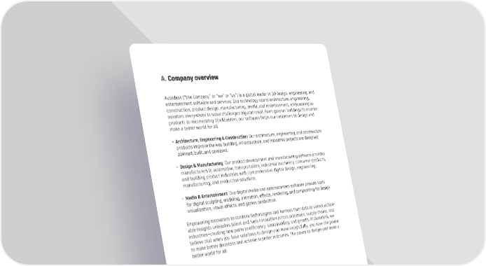 A. Company overview Autodesk (“the Company” or “we” or “us”) is a global leader in 3D design, engineering, and entertainment software and services. Our technology spans architecture, engineering, construction, product design, manufacturing, media, and entertainment, empowering in‑ novators everywhere to solve challenges big and small. From greener buildings to smarter products to mesmerizing blockbusters, our software helps our customers to design and make a better world for all. • Architecture, Engineering & Construction: Our architecture, engineering, and construction products improve the way building, infrastructure, and industrial projects are designed, planned, built, and operated. • Design & Manufacturing: Our product development and manufacturing software provides manufacturers in automotive, transportation, industrial machinery, consumer products, and building product industries with comprehensive digital design, engineering, manufacturing, and production solutions. • Media & Entertainment: Our digital media and entertainment software provide tools for digital sculpting, modeling, animation, effects, rendering, and compositing for design visualization, visual effects, and games production. Empowering innovators to combine technologies and harness their data to unlock action‑ able insights unleashes talent and fuels innovation across processes, supply chains, and industries—creating new paths to efficiency, sustainability, and growth. At Autodesk, we believe that when you have solutions to design and make insightfully, you have the power to make better decisions and achieve superior outcomes. The power to design and make a better world for all. Autodesk Sustainability Financing Framework | October 2021 4