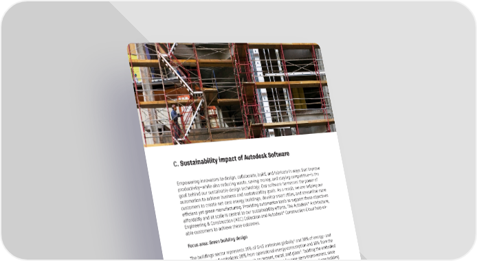 C. Sustainability impact of Autodesk Software Empowering innovators to design, collaborate, build, and fabricate in ways that improve productivity–while also reducing waste, saving money, and staying competitive–is the goal behind our sustainable design technology. Our software harnesses the power of automation to achieve business and sustainability goals. As a result, we are helping our customers to create net‑zero energy buildings, develop smart cities, and streamline more efficient yet green manufacturing. Providing automation tools to support these objectives ® affordably and at scale is central to our sustainability efforts. The Autodesk Architecture, ® Engineering & Construction (AEC) Collection and Autodesk Construction Cloud help en‑ able customers to achieve these outcomes. Focus area: Green building design 1 The buildings sector represents 19% of GHG emissions globally and 38% of energy‑ and process‑ related emissions: 28% from operational energy consumption and 10% from the 2 production of building materials such as cement, metal, and glass . Tackling the embodied carbon of building materials also offers great potential for near‑term improvement, since those materials will account for about half of the climate impacts of projected new building 3 construction between 2020 and 2050 . Reducing the impact of construction is essential, 4 since that industry consumes more than half of all extracted raw materials and generates 5 upwards of 36% of the waste stream in the developed West . We support customers with tools that tackle the total carbon impacts of the building life‑ cycle. The Embodied Carbon in Construction Calculator (EC3) helps customers choose car‑ bon‑smart materials that have lower embodied carbon. It uses information from publicly available datasheets, enabling building professionals to quickly compare different materials. 1 http://ipcc.ch/site/assets/uploads/2018/02/ipcc_wg3_ar5_chapter9.pdf, Chapter 9: Buildings. 2 https://globalabc.org/sites/default/files/inline‑files/2020%20Buildings%20GSR_FULL%20REPORT.pdf 3 http://worldgbc.org/sites/default/files/WorldGBC_Bringing_Embodied_Carbon_Upfront.pdf 4 http://www.mdpi.com/2075‑5309/4/3/266/pdf 5 https://ec.europa.eu/eurostat/statistics‑explained/index.php/Waste_statistics#Waste_generation_excluding_major_mineral_wastes Autodesk Sustainability Financing Framework | October 2021 7